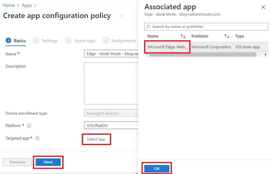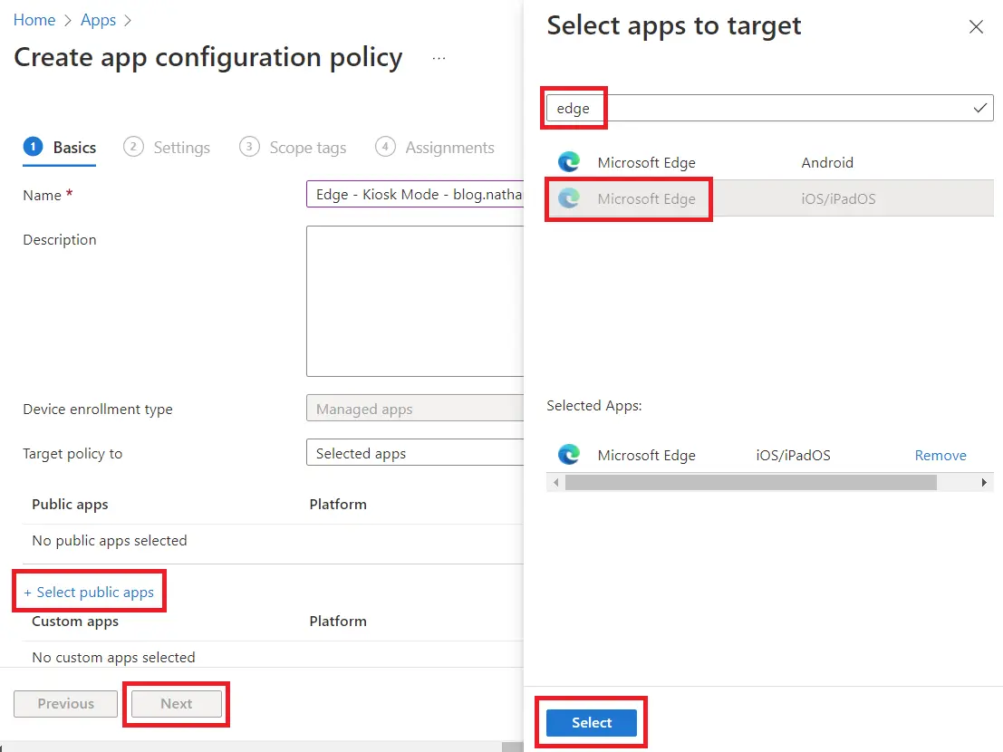 Provide a name for the policy, click Select public apps, click Microsoft Edge for iOS/iPadOS from the list, click Select, then click Next.