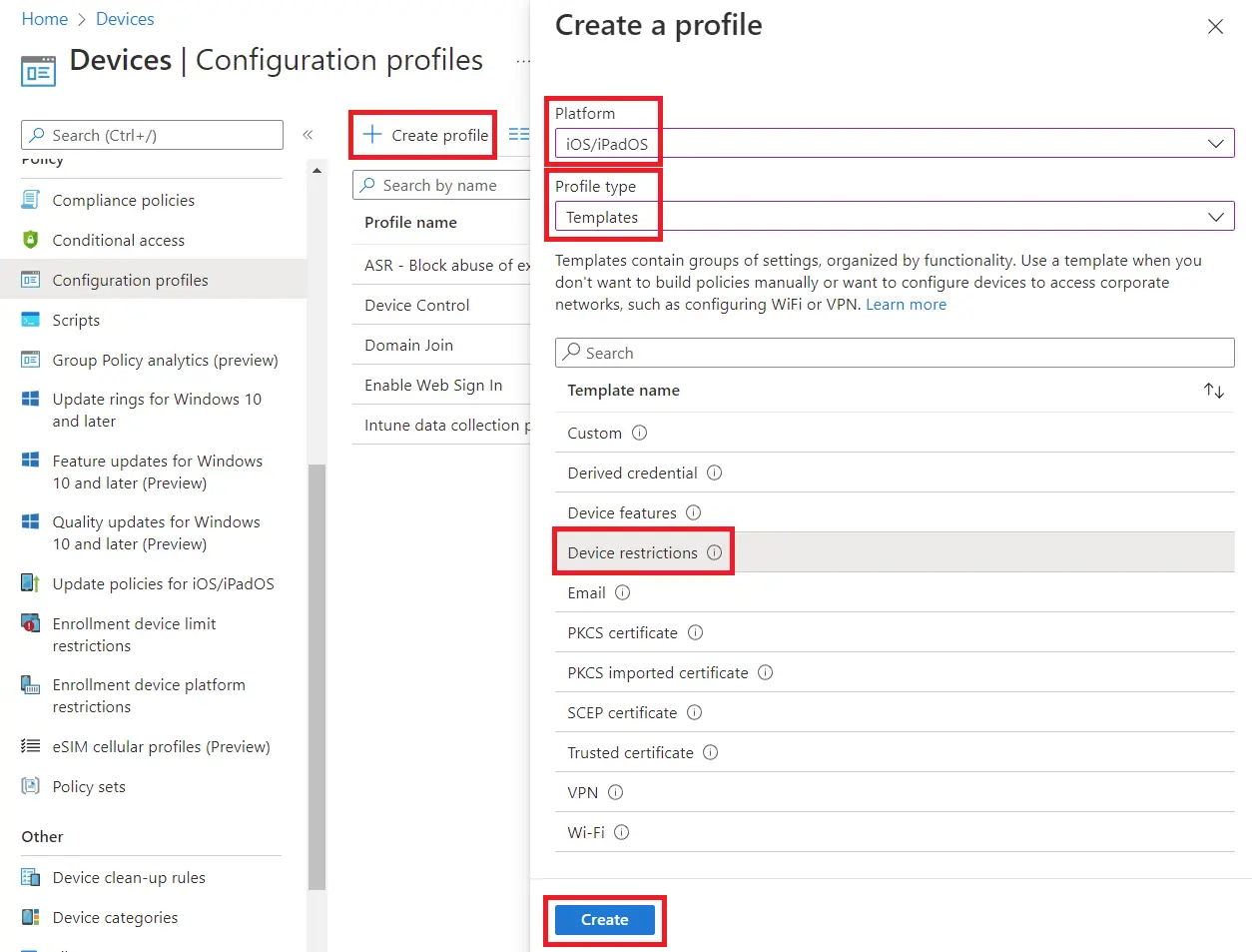 For the final step, navigate to Devices, scroll down and click on Configuration profiles, click Create profile, select iOS/iPadOS from the Platform dropdown, then select Templates from the Profile type dropdown. Under Template Name, select Device restrictions, then click Create.