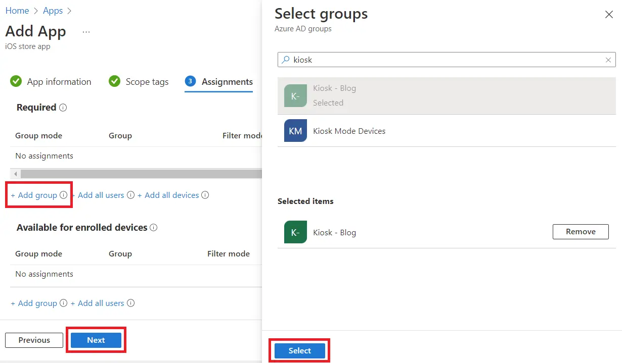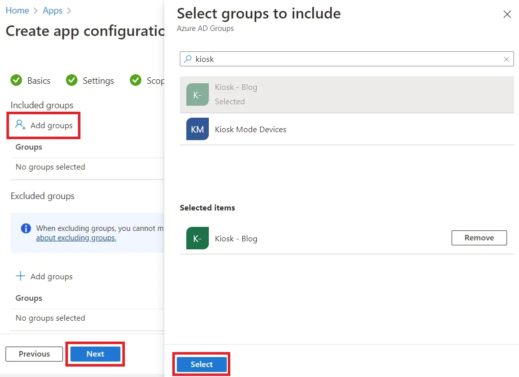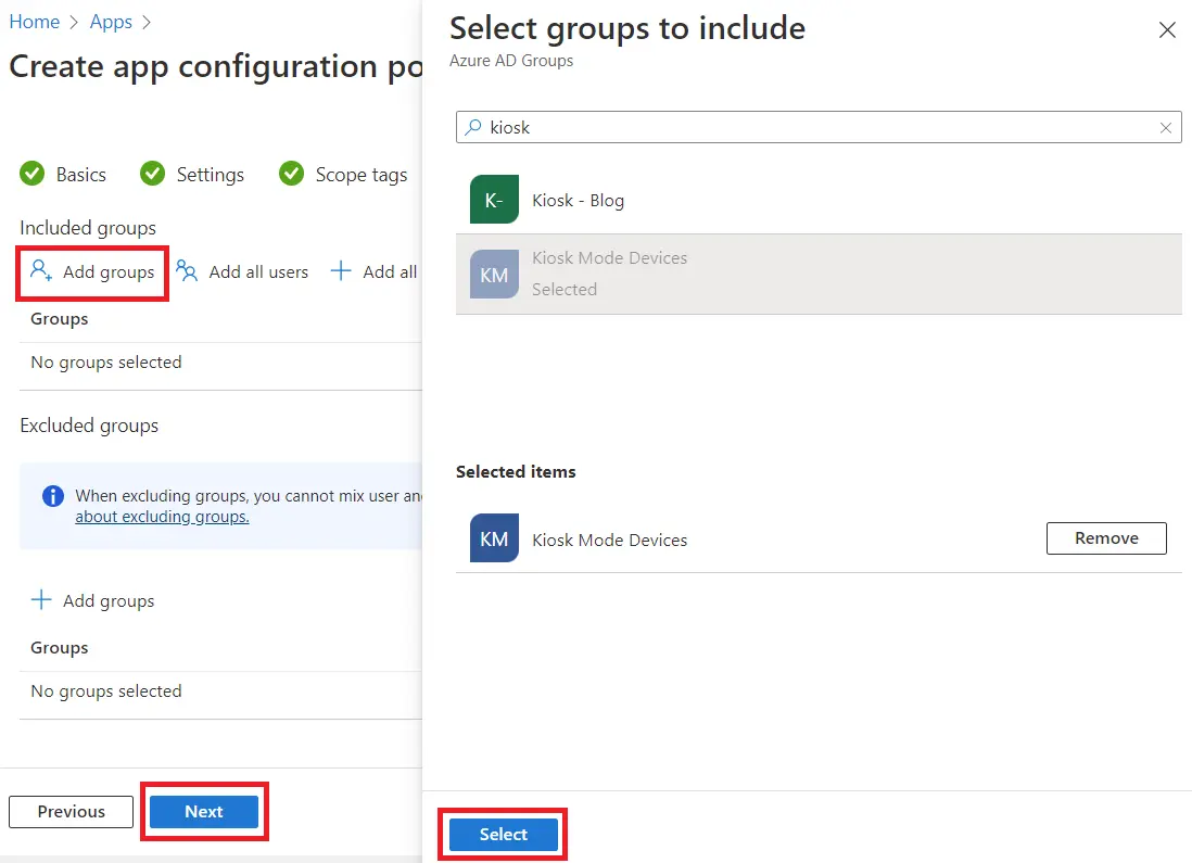 Select your scope tags if needed, then click Next. On the Assignments tab, click Add groups, search for your Kiosk group, click it in the list to add to the Selected items, then click Select. Finally, click Next, then review and click Create.