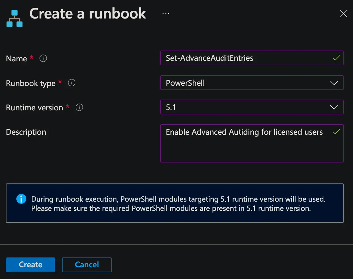 Provide a Name, set Runbook type to PowerShell, specify Runtime version (only testing with 5.1), and optionally add a description, then click Create.