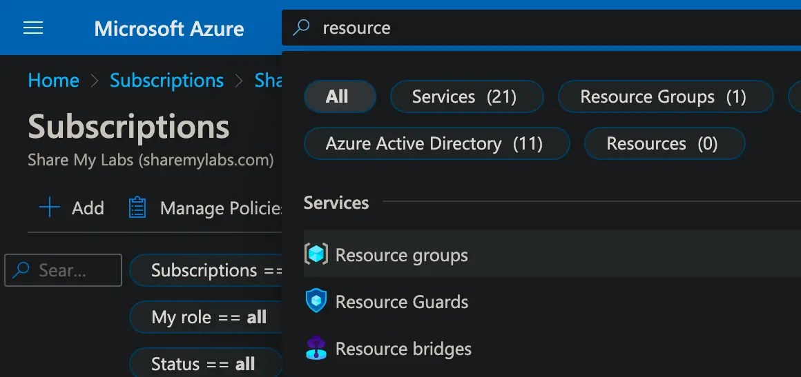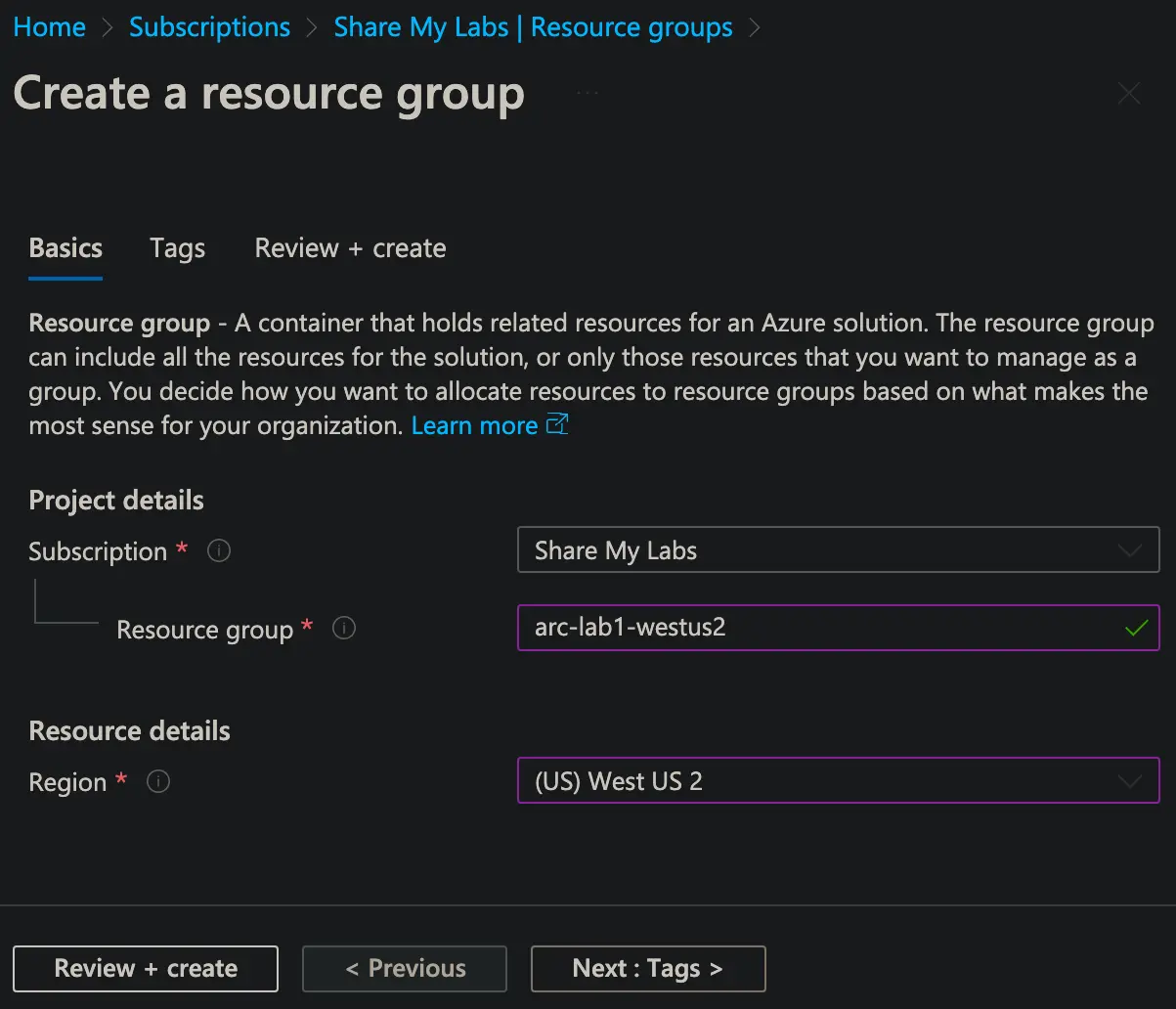Next, we need to create a Resource Group to put our servers in. Search for and select Resource Groups, then click Create. Select the Subscription, provide a name for the Resource Group, click Review + create, then click Create.