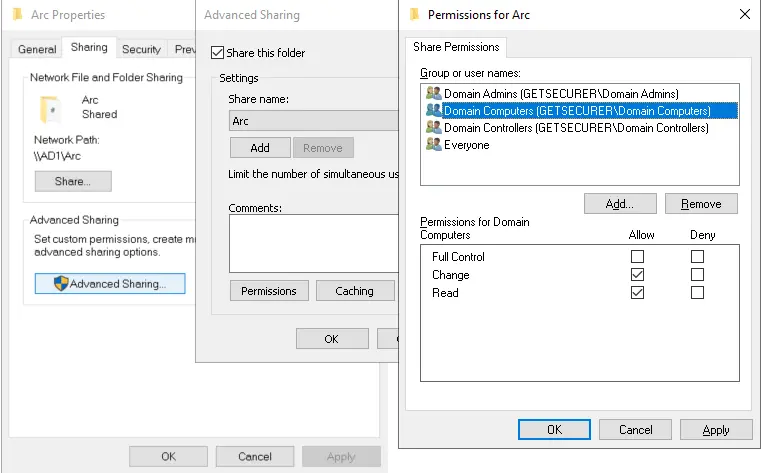 When creating the share, leave Everyone with Full Control (we will remove that after running the script) and add Change/Read permissions for Domain Admins, Domain Controllers, and Domain Computers. Note that NTFS permissions set by the script will ensure Domain Computers can only write logs back to one subfolder, and they will not be able to modify the installer or scripts ;)