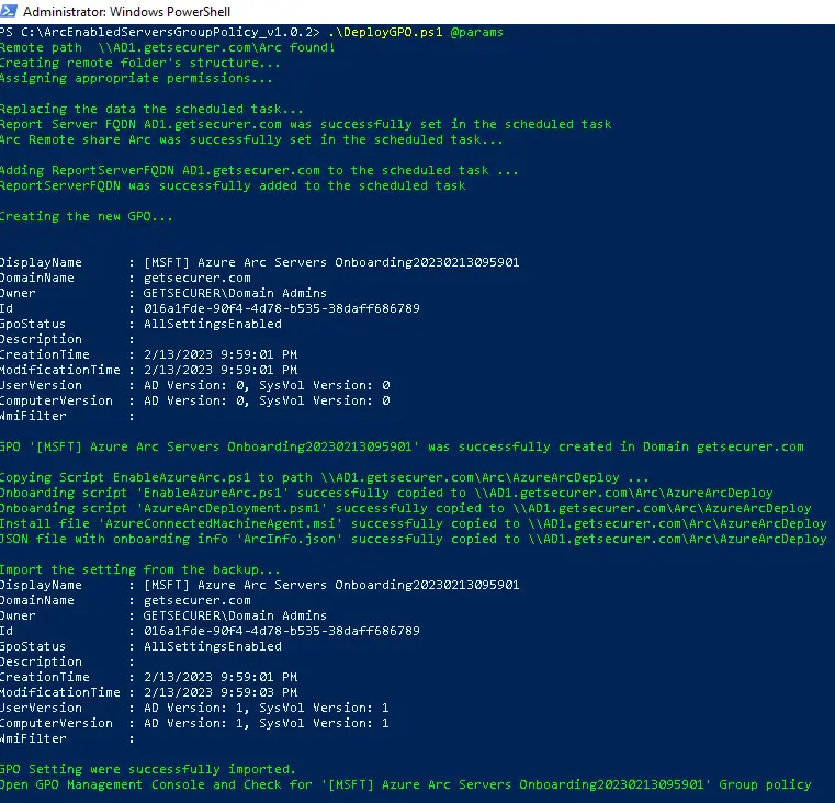 Now copy AzureConnectedMachineAgent.msi to the file share, extract the contents from ArcEnabledServersGroupPolicy.zip, run PowerShell as Admin, and browse to the files. Modify the following for your environment, and then run it :)