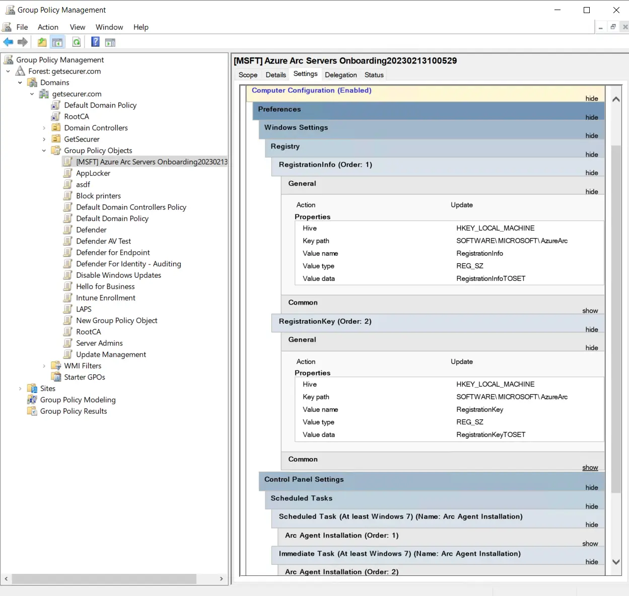 Now would be a good time to remove the Everyone permissions on the share so we don’t forget, and then we can review the GPO that was created in the Group Policy management console that was launched. Look for the [MSFT] Azure Arc Servers Onboarding GPO under Group Policy Objects. It should look like this: