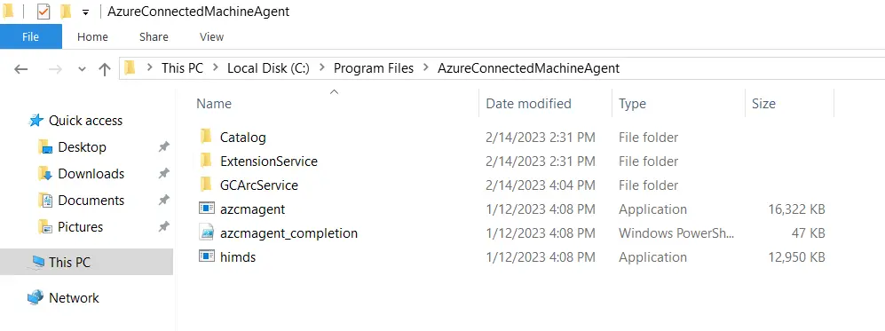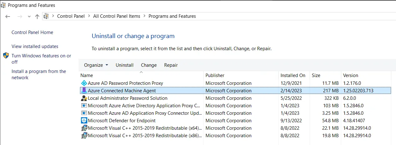 We can also verify installation by looking for Azure Connected Machine Agent in Add/Remove Programs and by looking under C:\Program Files\AzureConnectedMachineAgent (azcmagent.exe provides our config options).
