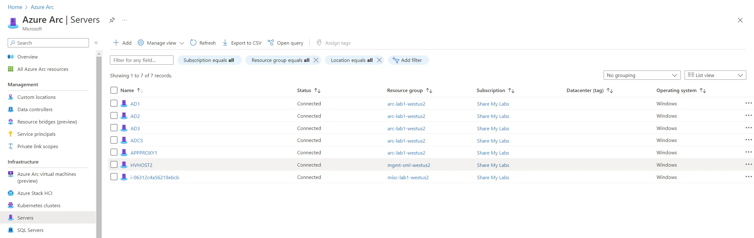 And finally, we can also verify successful onboarding by looking under Azure Arc | Servers in the Azure Portal. Unfortunately, this lab was all I had to work with right now, and I would always advise against starting with Tier 0 systems… :p Either don’t onboard Tier 0 or ensure they have a proper privilege separation.