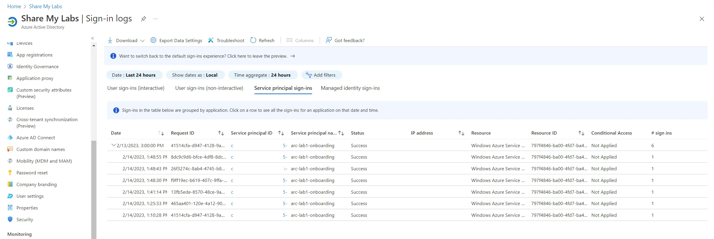If the agent is installing but not onboarding, double check that you see sign-in events for the Service Principal in Azure AD. If you see failures, it’s possible the secret has expired and may need to be generated again.