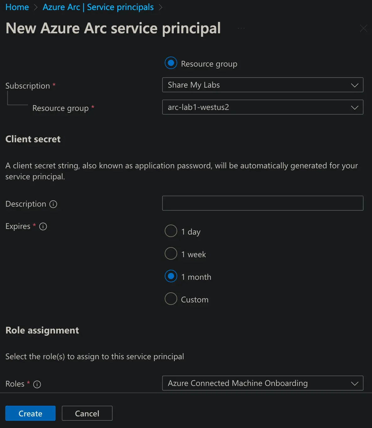 Click Add, provide a Name, then either scope to Subscription or Resource group (based on your IAM permission model), select an amount of time until the secret (password) expires, then select the Role of Azure Connected Machine Onboarding, then click Create. Note: While expiration can go up to 2 years, you may want to automate rotating the secret used with the onboarding script instead.