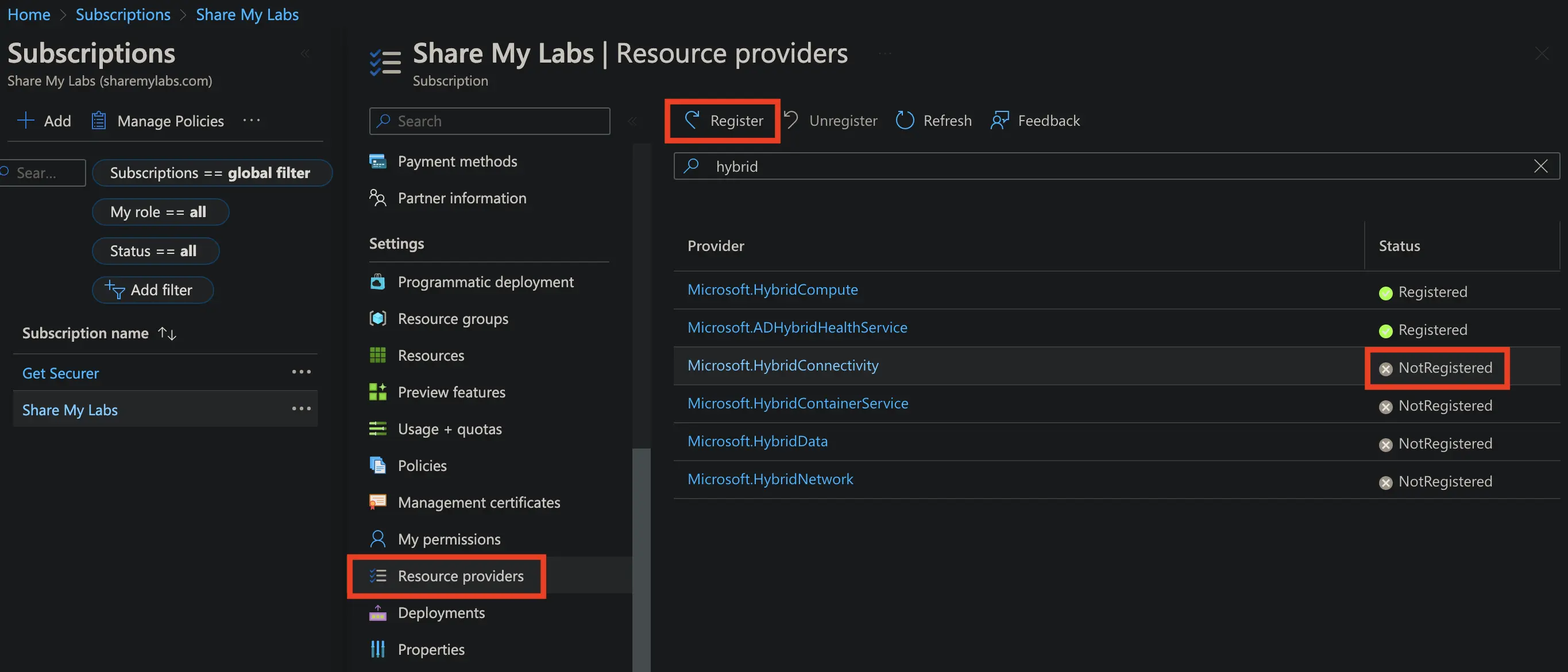 To verify or enable these providers, navigate to your Subscription in Azure, scroll down to Resource providers, then search for each of these items and make sure they are registered. If they are not, select them, then click Register.