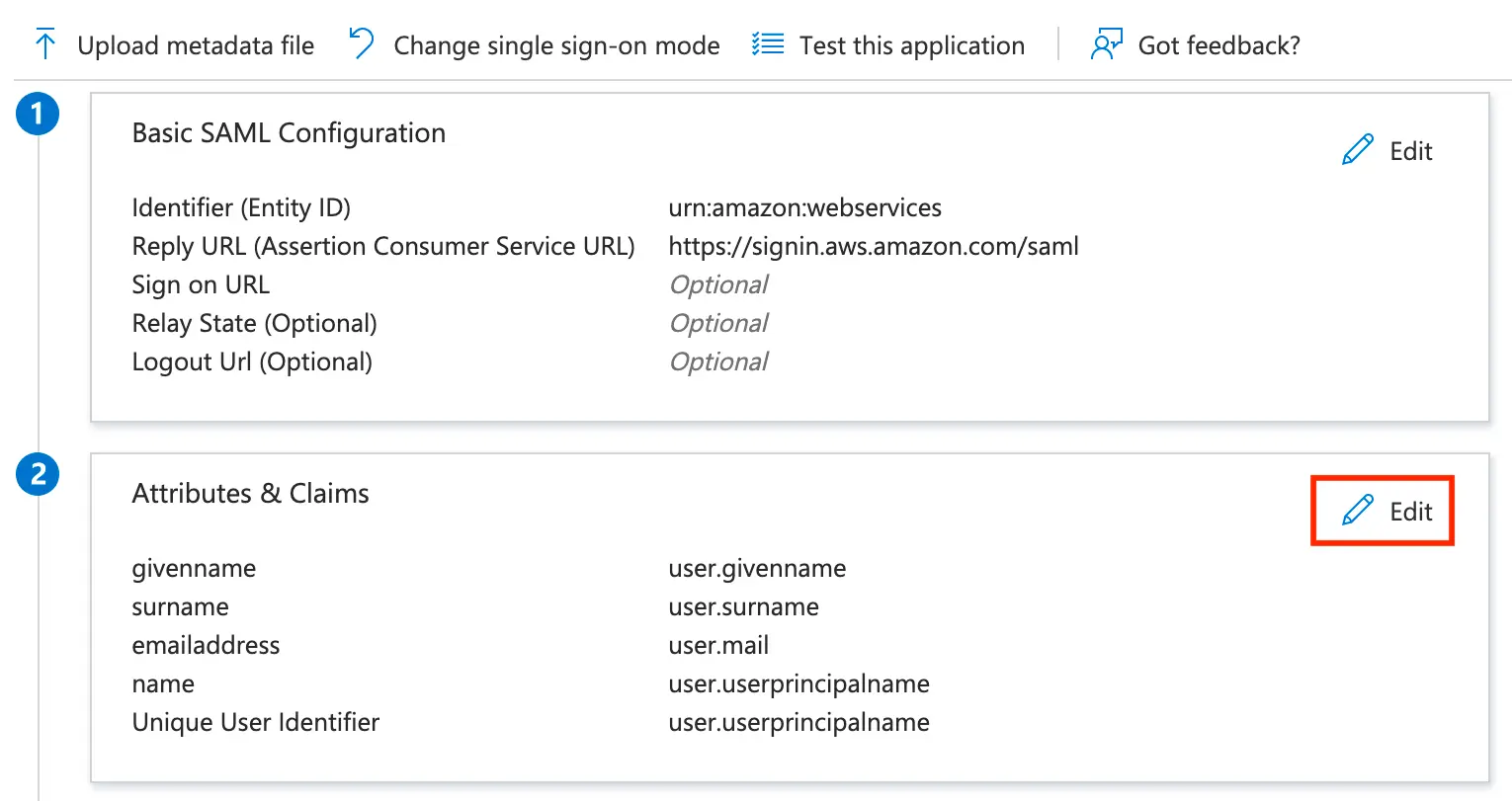 The unfortunate thing about creating a custom application is that the SAML information isn’t filled out for us, but fortunately, Amazon makes this very simple by publishing their metadata here: https://signin.aws.amazon.com/static/saml-metadata.xml