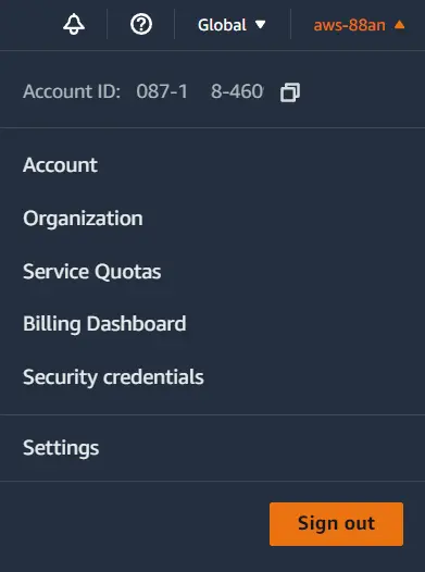 Before we begin, we need to know our AWS account ID. You can find this by signing into AWS, clicking your name in the top right, and then copying the Account ID.