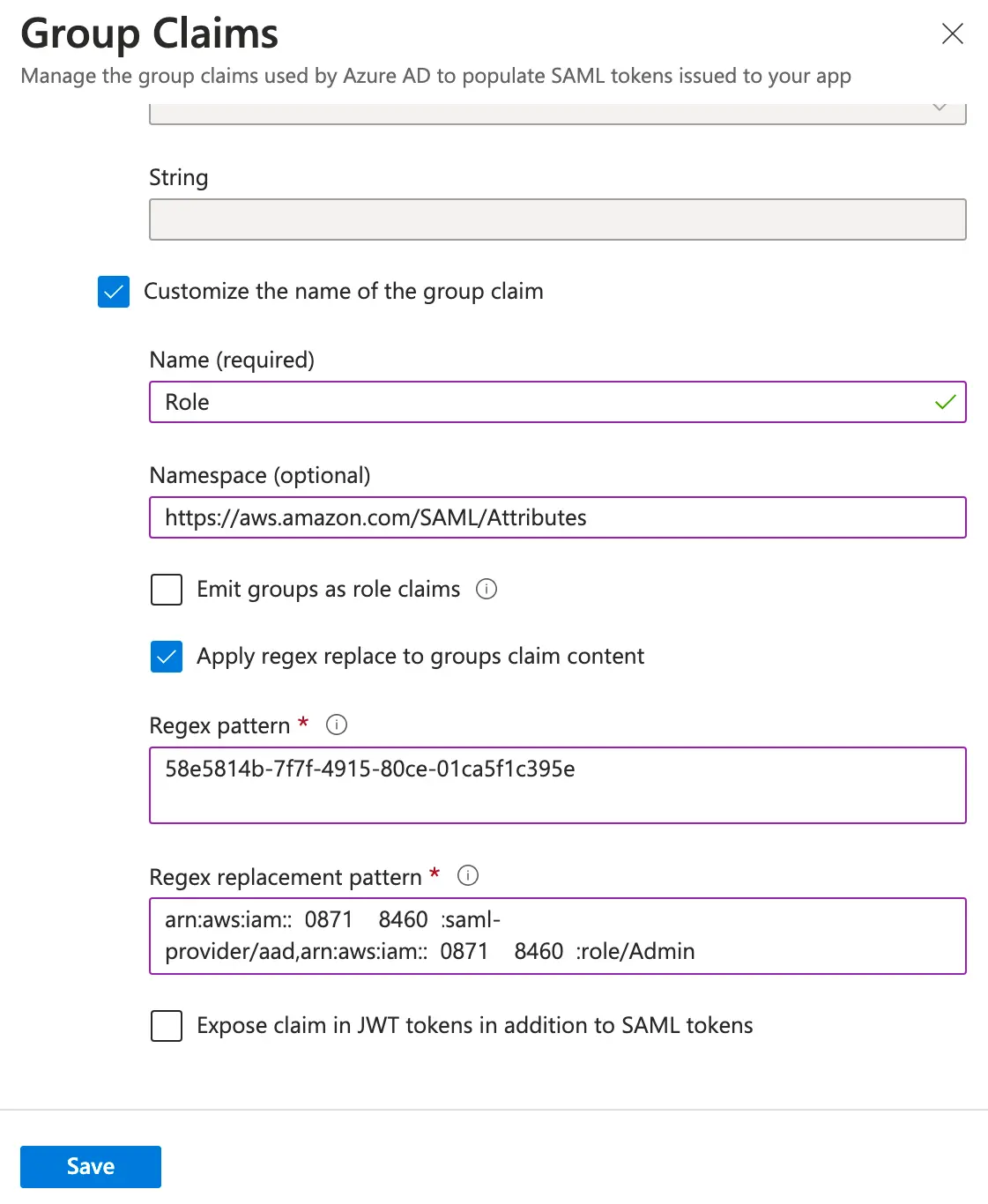 At the bottom, check the box for Customize the name of the group claim, check the box for Apply regex replace to groups claim content, and enter the following and click Save.