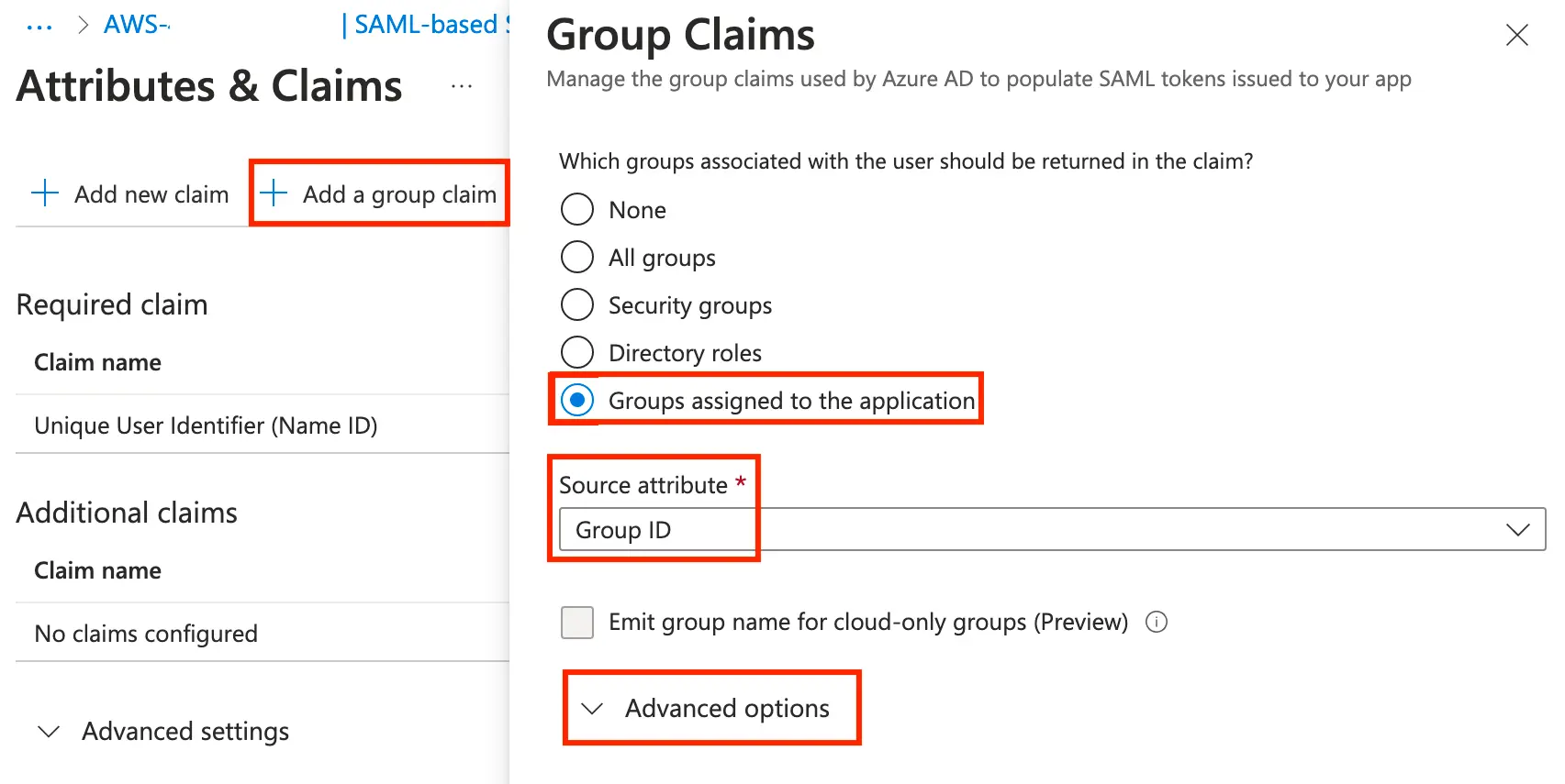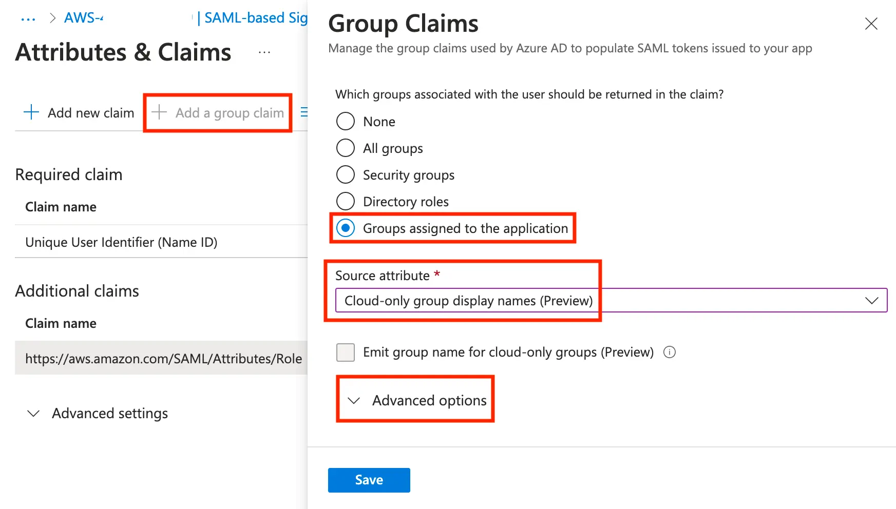 To start, click Add a group claim, select Groups assigned to the application, change the Source attribute to Cloud-only group display names (Preview), then expand Advanced options and scroll to the bottom.