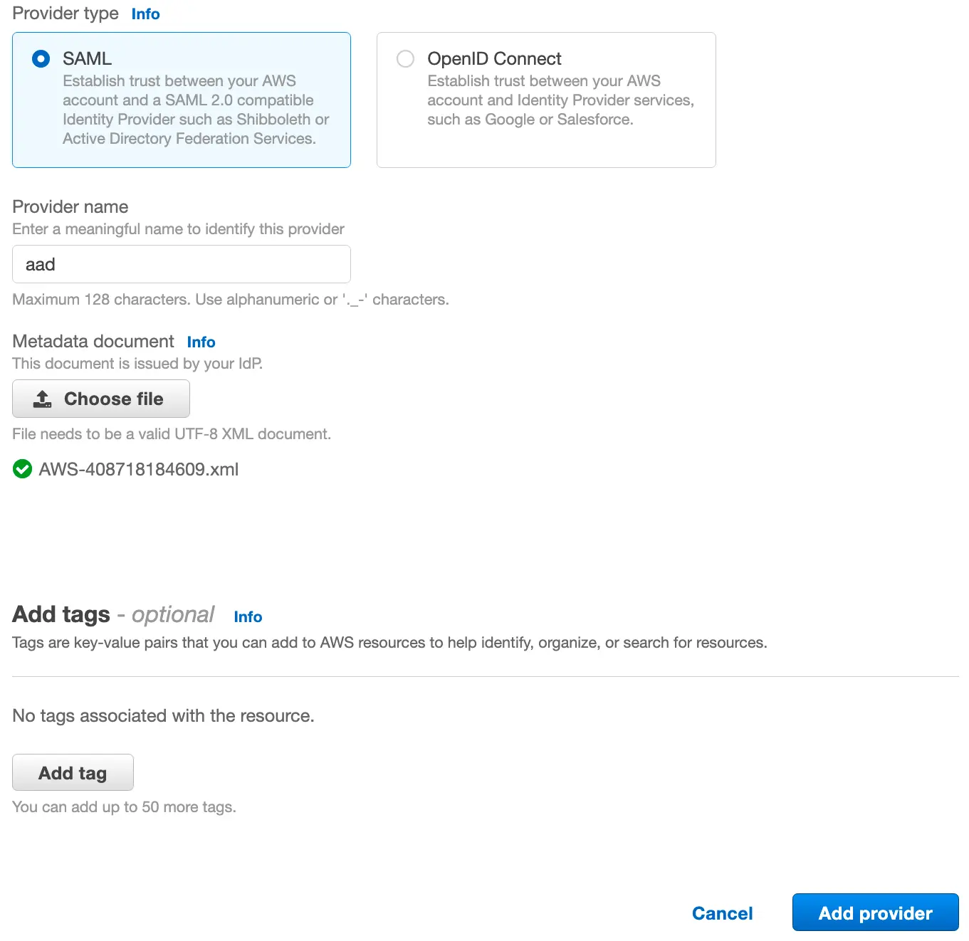 On the next page, leave SAML selected. For the provider name, I used aad in the regex pattern for the SAML token configuration, and it’s important that we use the same provider name here. Finally, click Choose file, select the metadata XML file we downloaded from Azure AD, then click Add provider.