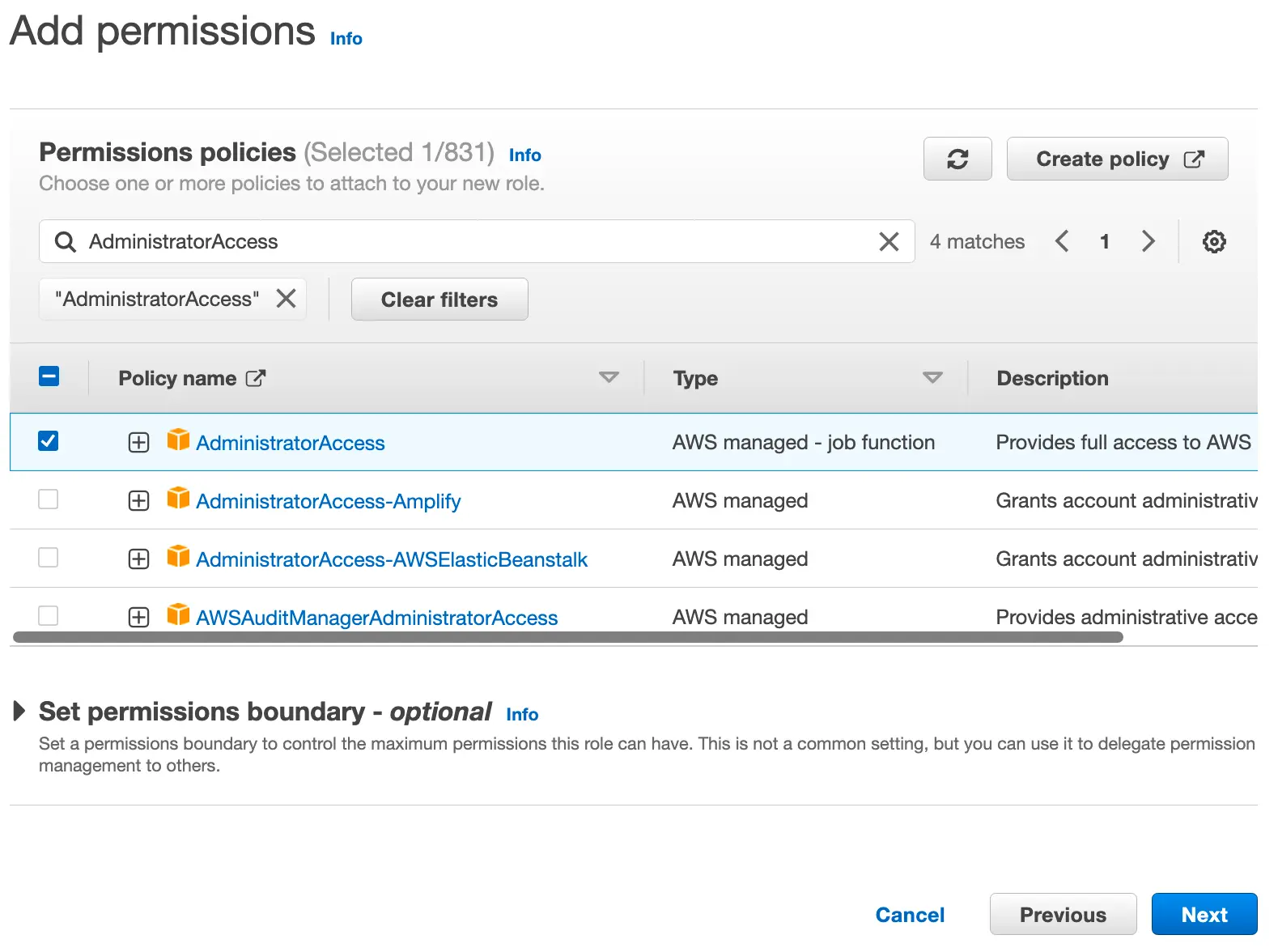 On the next page, search for AdministratorAccess (or whatever role you would like to add), check the box for the role, then click Next.
