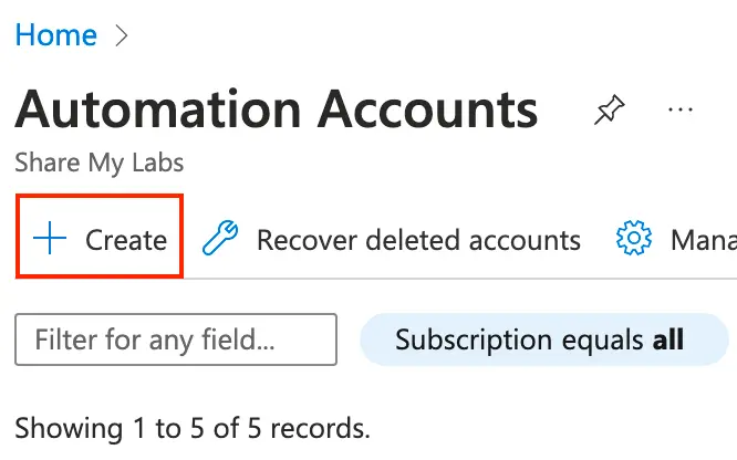 In the Automation Accounts, click Create.