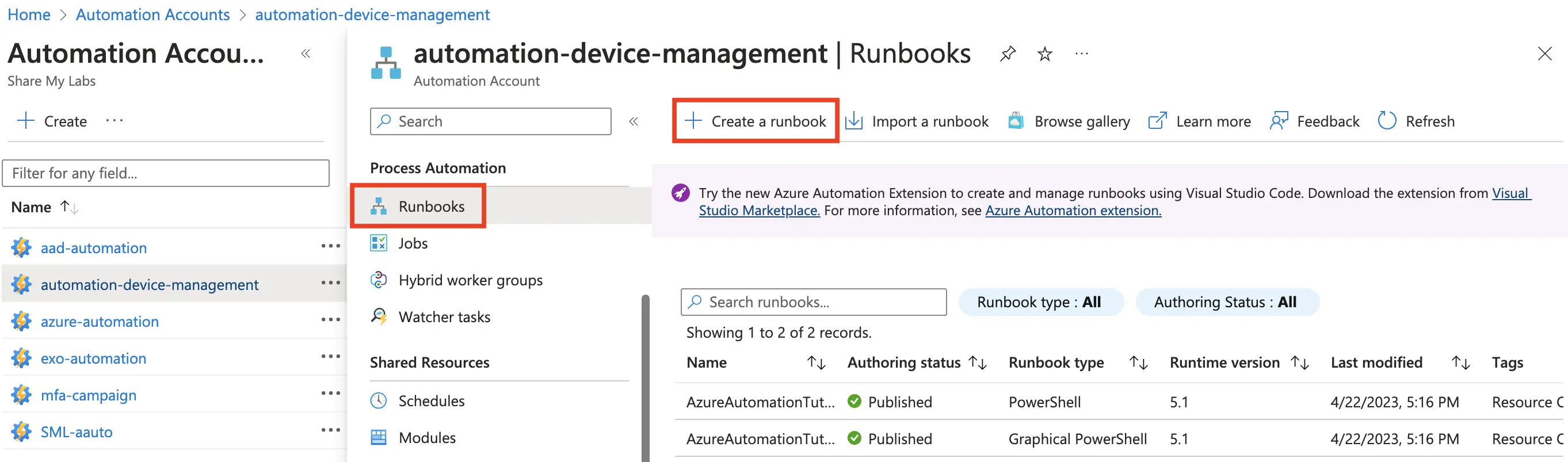 To verify that the modules imported successfully, go back to our Automation account, select Modules from under Shared Resources, then search for Microsoft. You should see Microsoft.Graph.Authentication and Microsoft.Graph.identity.DirectoryManagement listed. Unfortunately, we’re stuck with Runtime version 5.1 when using this method, so I’ll update this blog post once V2 modules are generally available so we can optimize this more.