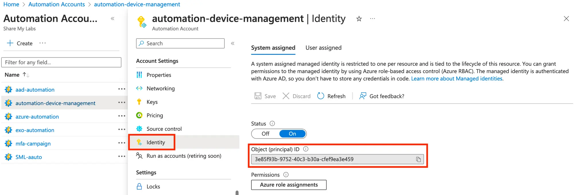 Unfortunately, there is currently no way to assign these permissions using Azure AD, so we will need to do this through Graph PowerShell. We will need to obtain the Object ID for the System Assigned Managed Identity, so we can grant it permissions. To find this, go to Identity under Account Settings and copy the Object (principal) ID.