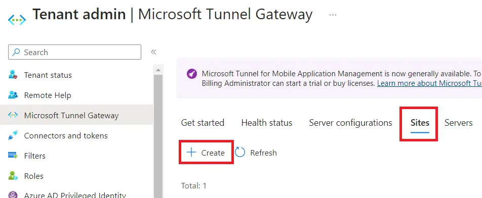 Click Next when done, specify any scope tags, then click Next, and finally click Create if everything looks good. Now click on the Sites tab, then click Create