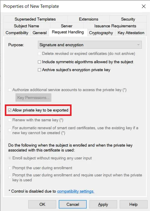 On the Request Handling tab, check the box for Allow private key to be exported as we will need to request and export this to bring to our Linux server.