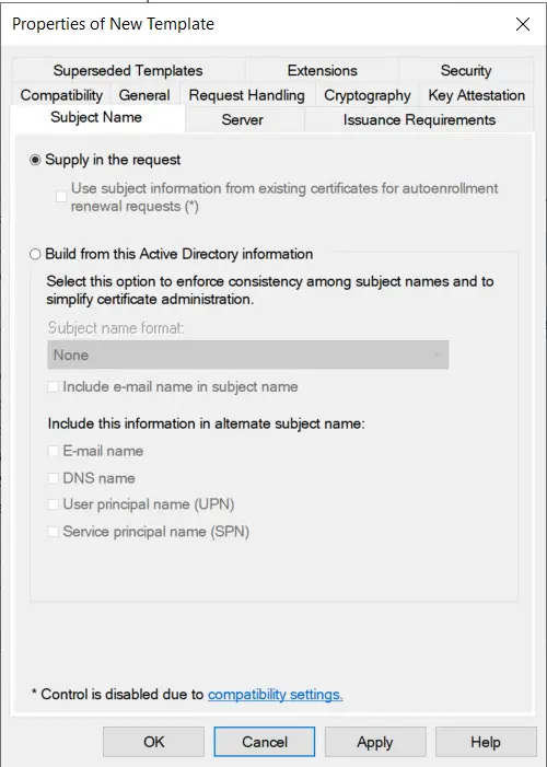 Finally, on the Subject Name tab, verify that Supply in request is selected, then click OK to save the template.