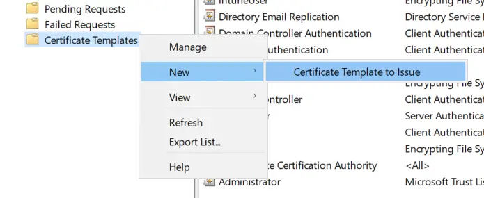 Back in our Certification Authority MMC, right click Certificate Templates, hover over New, then click Certificate Template to Issue.