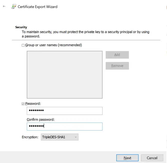 PFX should already be selected, and the defaults should be fine. Click next, then check the Password box and provide a password, then click Next.