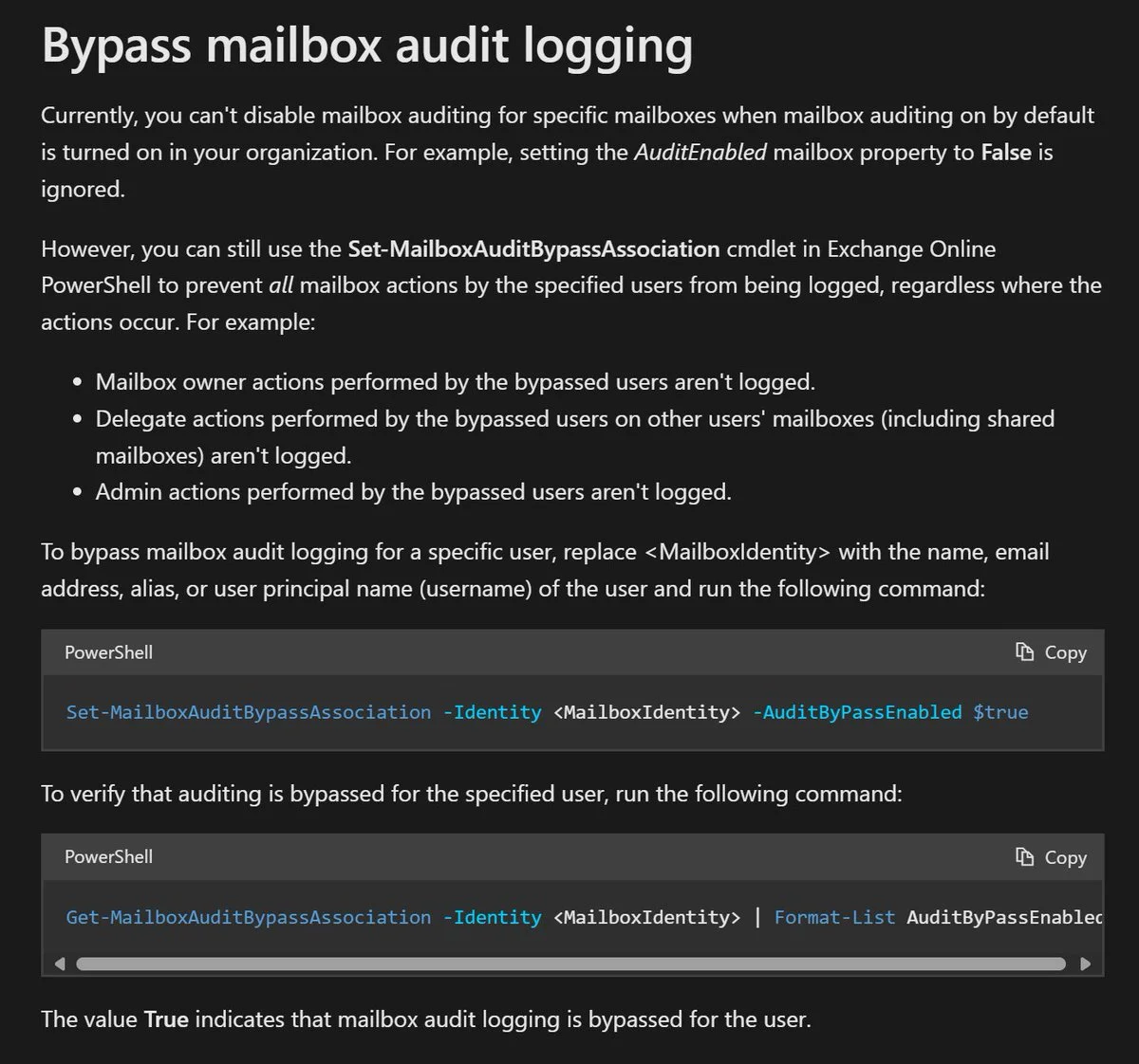 Because mailbox auditing can generate a large volume of data, Microsoft provides the ability to bypass auditing for specific accounts (such as a service account, backup, etc.). It is important to verify accounts that can bypass auditing and also monitor for changes to this.
