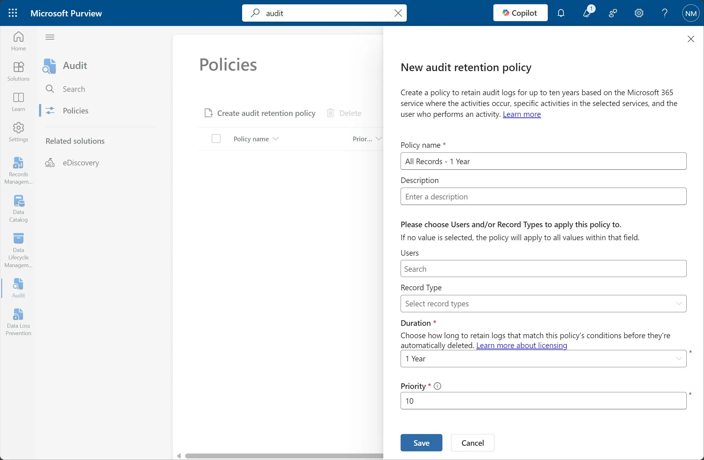 This policy only applies to users with the Microsoft 365 Advanced Audit SKU assigned, audit records are retained for 1 year. Audit records for users without this SKU are retained for 180 days (thanks CISA for the bump up from 90 days!).